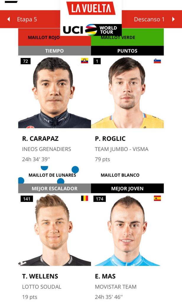 Mañana es día de descanso, que viene bien a Richard para recuperar energías del altísimo desgaste de hoy. Además, para ahora definir, junto a su equipo, las estrategias que le permitan conservar de largo la camiseta roja.