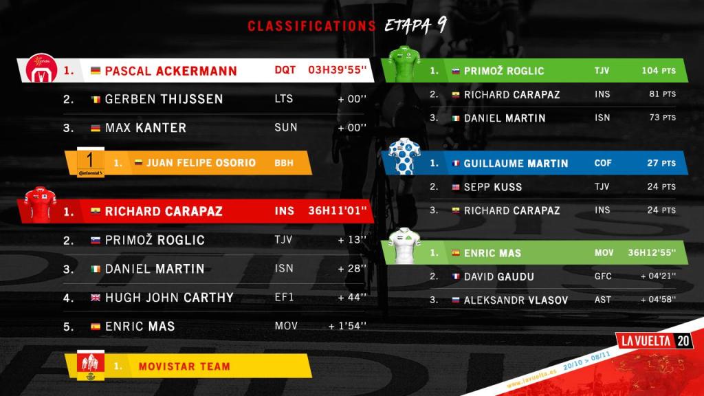 El actual mejor ciclista de Ecuador hoy no tuvo complicaciones para mantenerse al tope de la Clasificación General, tras la novena etapa. Le fue suficiente con entrar a la meta en el puesto 24, ya que su escolta inmediato, Primoz Roglic, terminó 44 (con el mismo tiempo que el triunfador de hoy, 3:39:55).