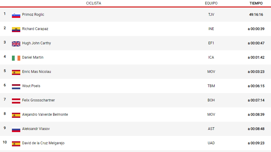 Sin ser su especialidad, este martes 3 de noviembre hizo una carrera espectacular en la contrarreloj individual, demostrando madurez y superación. Remató en séptimo lugar, a 49 segundos del ganador: Roglic, quien hizo 46:39.48 para los 33.7 km de recorrido.