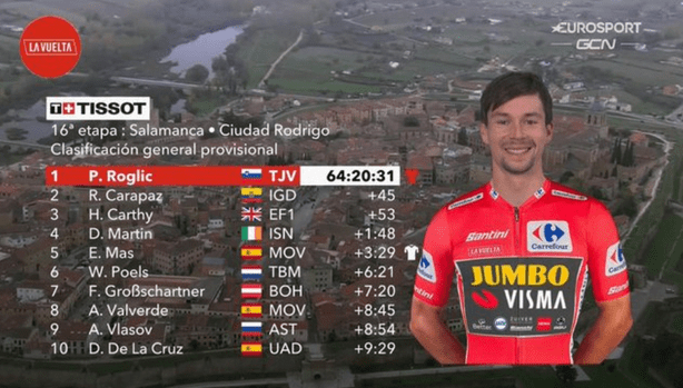 En un cierre de infarto, la etapa 16 fue para el danés Magnus Cort Nielsen. Roglic entró segundo y Richie, sexto. Los tres recibieron el mismo tiempo: 04:04:35. Claro que la diferencia entre los dos líderes subió a 45”, ya que el ciclista esloveno hoy bonificó con seis segundos.