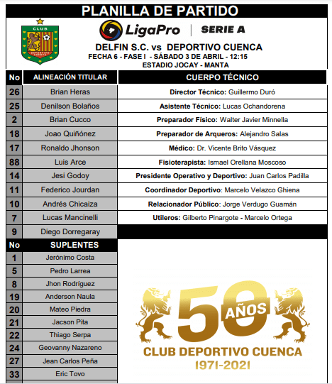 Con goles de Jhon Jairo Cifuente y Eric Tovo, marcados a los 20 y 80 minutos, Delfín y Deportivo Cuenca empataron 1-1. El partido correspondiente a la fecha 6 de la LigaPro, Serie A, se jugó la tarde de este sábado 3 de abril en el estadio Jocay de Manta.