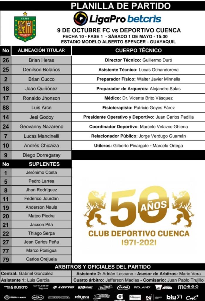 Con goles de José Fajardo y Renny Jaramillo, marcados a los 10 y 14 minutos, 9 de Octubre FC ganó 2-1 al Deportivo Cuenca, que descontó al minuto 44 con anotación del argentino Diego Dorregaray. El cotejo válido por la fecha 10 de la LigaPro se jugó la tarde de este sábado 1 de mayo en el estadio Modelo Alberto Spencer de Guayaquil.