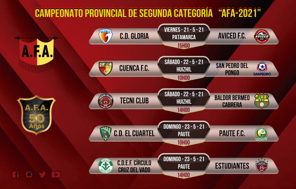 Con el juego entre Deportivo Gloria y Aviced F.C. se inicia el Campeonato Provincial de Segunda Categoría, organizado por la Asociación de Fútbol del Azuay (AFA). El partido arranca la tarde de este viernes 21 de mayo, desde las 15:00, en la cancha del complejo de Patamarca.