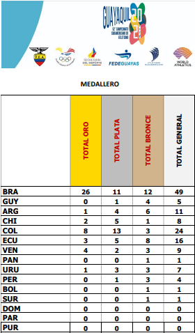 Con 3 medallas de oro, 5 de plata y 8 de bronce, Ecuador terminó tercero en la clasificación general del Campeonato Sudamericano Absoluto de Atletismo. Después de tres días de competencias, realizadas hasta la tarde de este lunes 31 de mayo en Guayaquil, Brasil y Colombia terminaron primero y segundo.