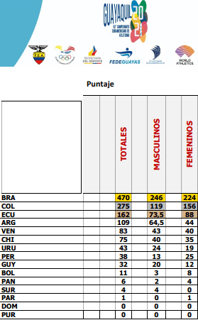 También la posta mixta 4×400 (Anderson Colorado, Virginia Villalba, Evelyn Mercado y Alan Minda), el relevo femenino 4×100 (Ginger Quintero, Katherine Chillambo, Nicole Caicedo y Marizol Landázuri) y la posta masculina 4×400 (Edson Acuña, Alan Minda, Miguel Maldonado y Anderson Espinales).