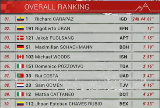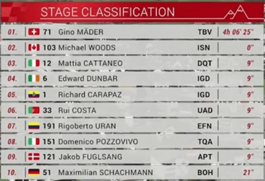 La última etapa cubrió 118 kilómetros de trayecto, con predominio de montaña. Fue ganada por el suizo Gino Mäder, quien registró 4:06:25, superando a Michael Woods y Mattia Cattaneo. El pedalista carchense de 28 años se mostró cómodo en compañía de todo su equipo (@INEOSGrenadiers), cuyos compañeros hicieron el papel de gregarios. El ‘mijín’ llegó 9 segundos después de Mäder.