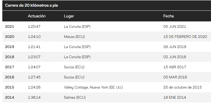 Desde que empezó a competir oficialmente, en el 2007, nunca ha sufrido una descalificación. En La Coruña, España, cronometró 1:20:41 y tras superar la marca mínima exigida (1:21:00) clasificó para los Juegos Olímpicos en Sapporo, Japón. Como nunca antes, en La Coruña recibió dos amonestaciones y en eso pondrán énfasis en los últimos entrenamientos con el técnico lojano Luis González.