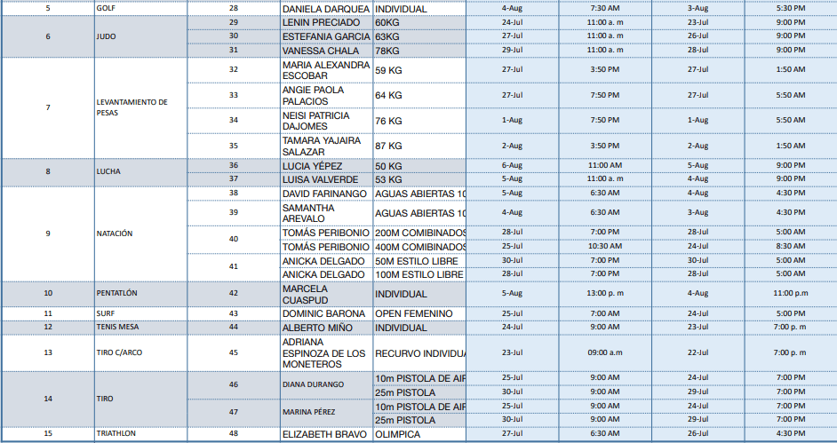 Ecuador tendrá una delegación de 48 seleccionados de 17 disciplinas. El atletismo es el deporte con el mayor número de clasificados: 18. Luego están boxeo y levantamiento de pesas, con 4 cada uno; mientras judo tendrá 3 representantes. Luego vienen disciplinas con 2 y 1 seleccionados.