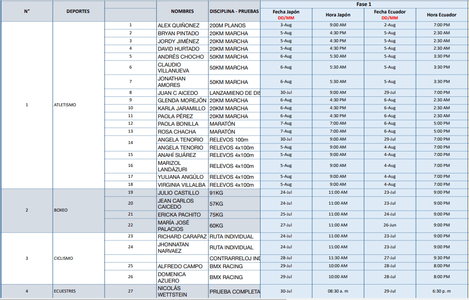 De los 18 atletas con cupo olímpico, Álex Quiñónez peligra su participación porque tiene la sanción de un año que le impuso el Tribunal Disciplinario de Londres. El motivo: incurrió en tres incumplimientos de paradero en el periodo de 12 meses. La Federación Ecuatoriana Atletismo anunció que el seleccionado nacional apelará citada sanción para poder correr en Tokio.