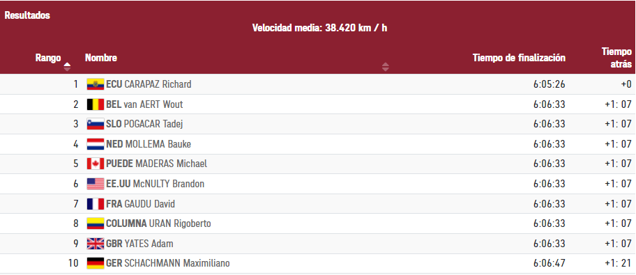 Los 10 mejores en la prueba de ruta. El ecuatoriano Johathan Narváez terminó 47-º