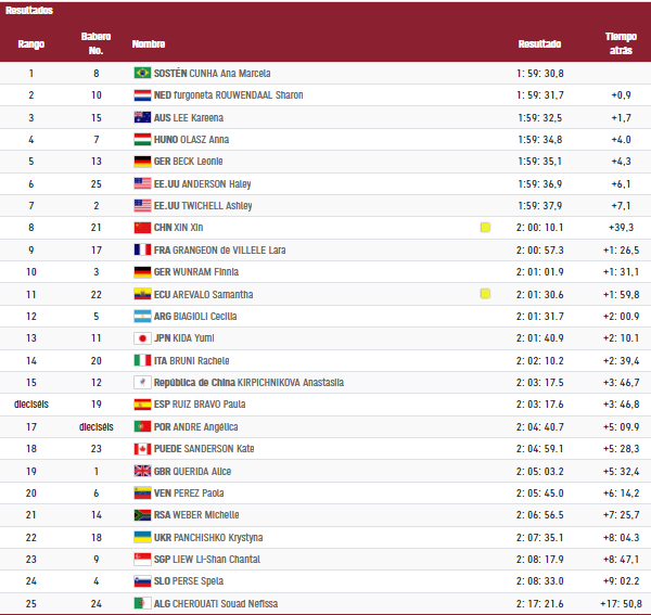 La representante de Morona Santiago nadó el primer kilómetro en el último lugar (25), luego fue ganando posiciones. En los 2, 5 km se ubicaba en el casillero 22; mientras en la mitad de la prueba (5 km) ya ocupaba el puesto 12. Después escaló un puesto más y así terminó la competencia (11).