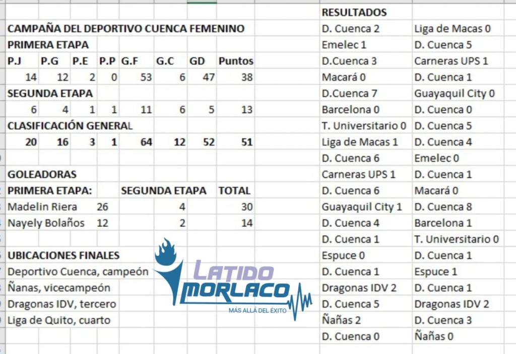 La campaña del Deportivo Cuenca, campeón de la Superliga Femenina de Fútbol, se resume en 16 triunfos, 3 empates y 1 derrota; es decir, sumó 51 puntos de 60 en disputa. Marcó 64 goles y recibió 12 anotaciones en los 20 partidos de la primera fase, cuartos de final, semifinales y finales.