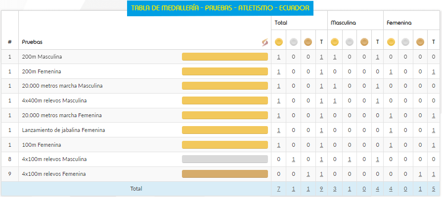 A las 5 medallas de oro conseguidas este viernes 3 de diciembre, hay que sumar las dos doradas que se consiguieron en días anteriores el andarín pichinchano David Hurtado, en 20 000 m., y con la misma Anahí Suárez, en 100 m planos.