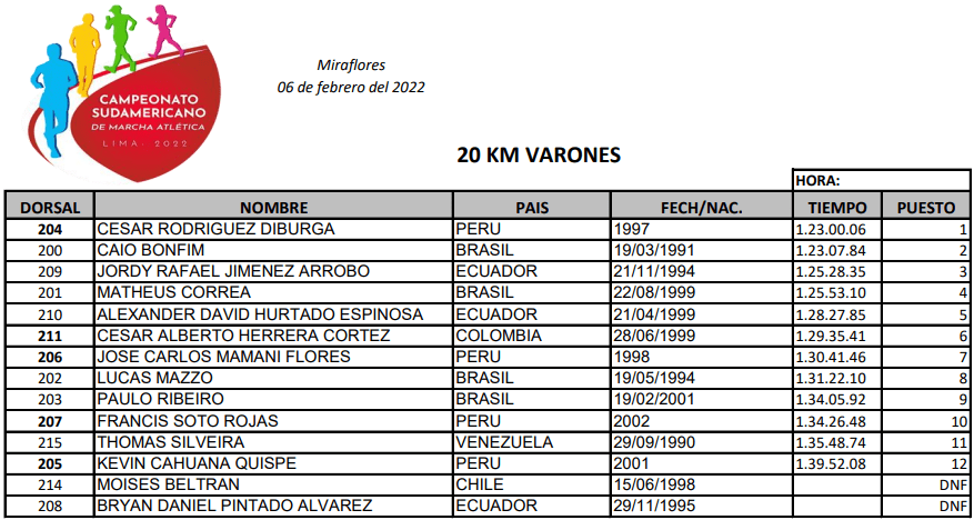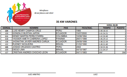 También vale destacar los quintos lugares de David Hurtado y Jonathan Amores, en 20 y 35 km. Igual el cuarto y octavo puestos de Karla Jaramillo y Paula Torres, en 20 km.