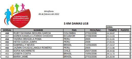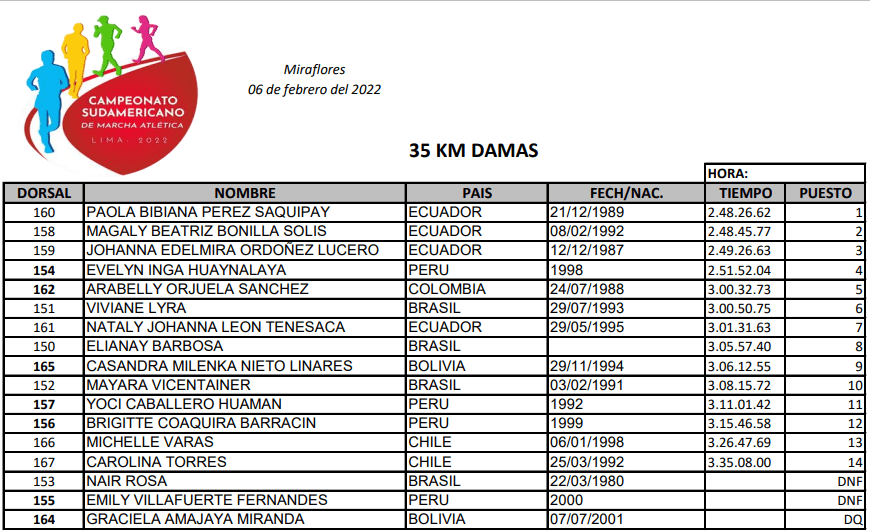 Pérez estableció nuevo récord sudamericano en 35 km marcha (2:48.26), mejorando las 2:51.11 de la brasileña Erica Rocha de Sena, registrado el 13 de marzo del 2021 en Macas. Las campeona sudamericanas de 35 y 20 km tienen asegurada su participación en el Mundial por Equipos que se cumplirá en Muscat, Omán, el 5 y 6 de marzo. El resto de la delegación ecuatoriana se definirá en los próximos días, de acuerdo con los tiempos registrados, criterios de selección y según la disponibilidad económica de la Federación Ecuatoriana de Atletismo.
