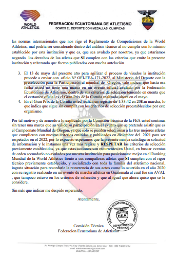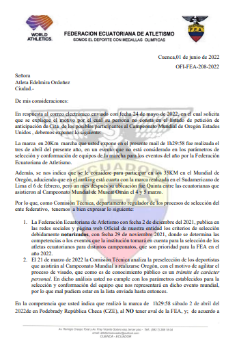 Además, se nos indica que se le considere para participar en los 35KM en el Mundial de Oregón, aduciendo que en el ranking está cuarta con la marca realizada en el Sudamericano de Lima el 6 de febrero, pero un mes después su ubicación fue Quinta entre las ecuatorianas que asistieron al Campeonato Mundial de Muscat Omán el 4 y 5 marzo”. (lea abajo el oficio completo).