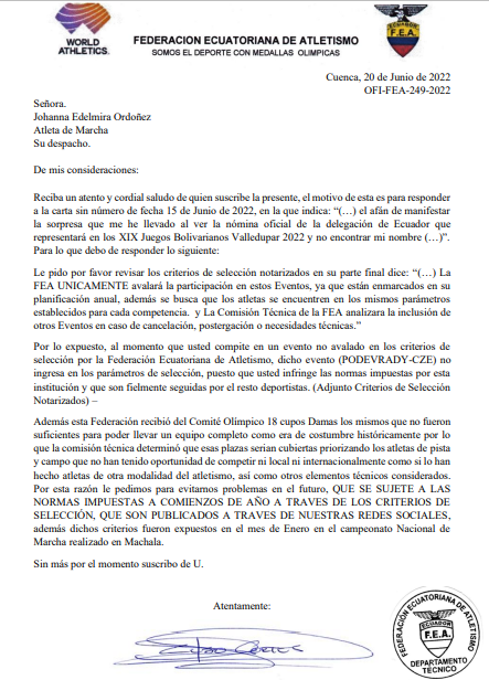 “Reciba un atento y cordial saludo de quien suscribe la presente, el motivo de esta es para responder a la carta sin número de fecha 15 de Junio de 2022, en la que indica: “(…) el afán de manifestar la sorpresa que me he llevado al ver la nómina oficial de la delegación de Ecuador que representará en los XIX Juegos Bolivarianos Valledupar 2022 y no encontrar mi nombre (…)”. Para lo que debo de responder lo siguiente: Le pido por favor revisar los criterios de selección notarizados en su parte final dice: “(…) La FEA UNICAMENTE avalará la participación en estos Eventos, ya que están enmarcados en su planificación anual, además se busca que los atletas se encuentren en los mismos parámetros establecidos para cada competencia. y La Comisión Técnica de la FEA analizara la inclusión de otros Eventos en caso de cancelación, postergación o necesidades técnicas.” Por lo expuesto, al momento que usted compite en un evento no avalado en los criterios de selección por la Federación Ecuatoriana de Atletismo, dicho evento (PODEVRADY-CZE) no ingresa en los parámetros de selección, puesto que usted infringe las normas impuestas por esta institución y que son fielmente seguidas por el resto deportistas” (Ver el oficio completo).