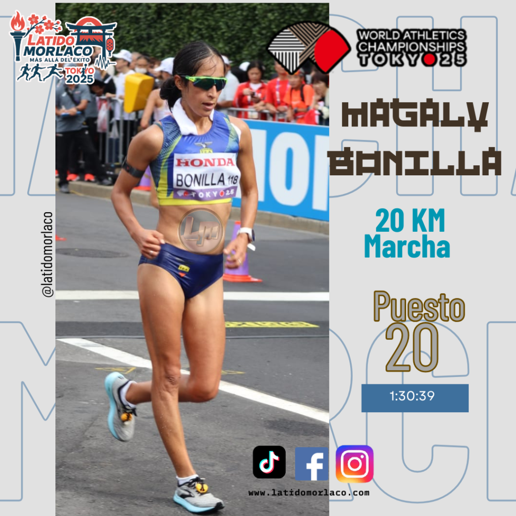 La tungurahuense Magaly Bonilla luchó, en los primeros tramos de la competencia, en el segundo grupo de marchistas en la distancia de 20 km. Se notó que físicamente dejó todo y al final se quedó con la posición número 20.
