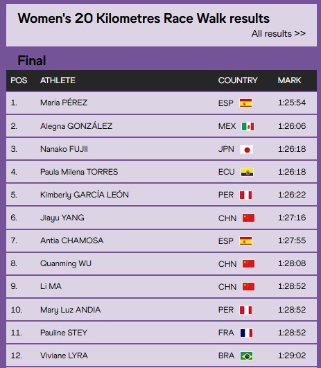 Mientras tanto, en los 20 kilómetros, Torres se quedó a décimas de repetir la presea de bronce al no alcanzarla en su remate a la japonesa Nanako Fujii (ver resultados finales).