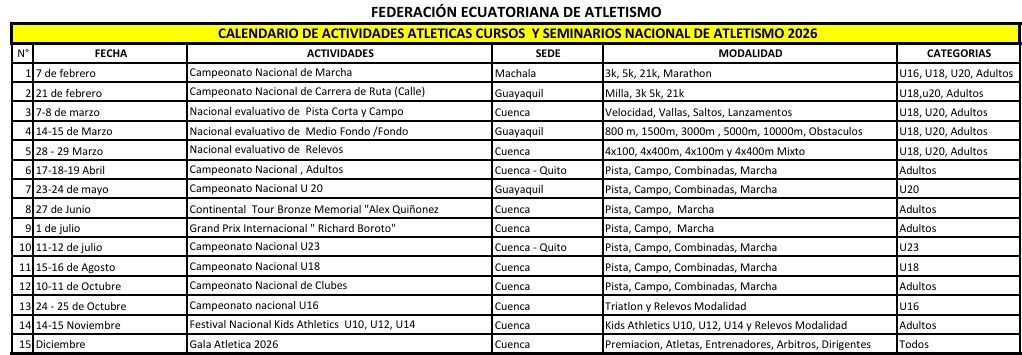 El calendario de competencias del 2026 arrancará con el Nacional de Marcha, en Machala, en las distancias de 3, 5, 21 (media maratón) y 42 kilómetros (maratón). Competirán los andarines de las divisiones Sub 16, Sub 18, Sub 20 y Adultos.