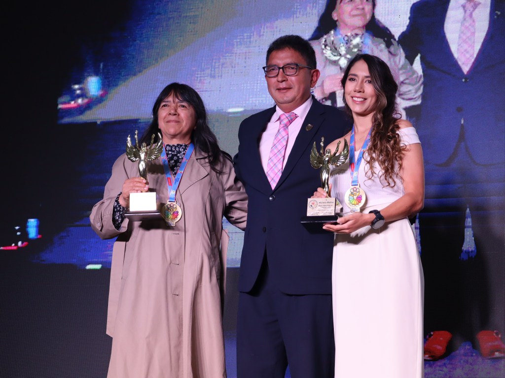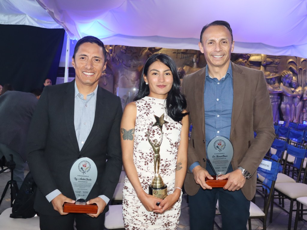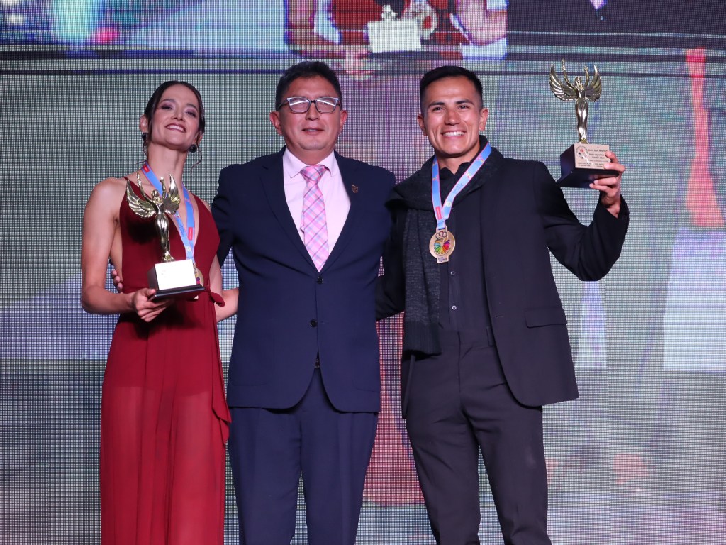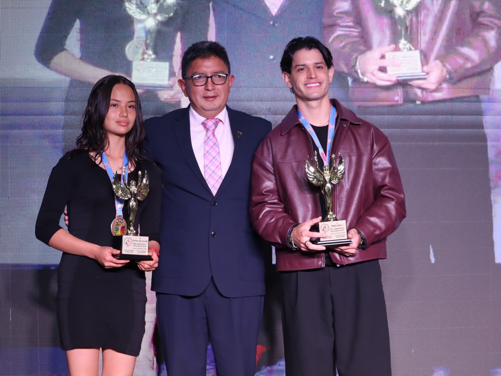 Paula Torres, Mejor Deportista del Azuay 2025, acompañada de Andrés Chocho y Manuel Bravo, Mejores: Entrenador y Dirigente