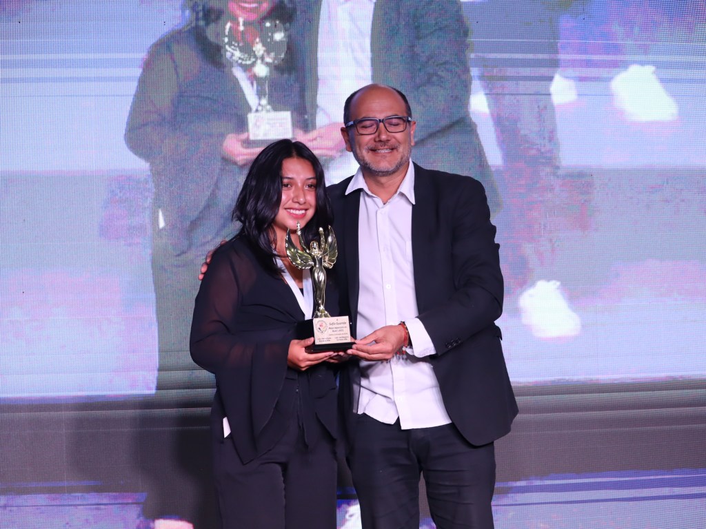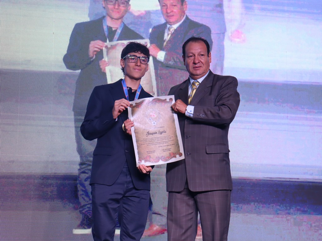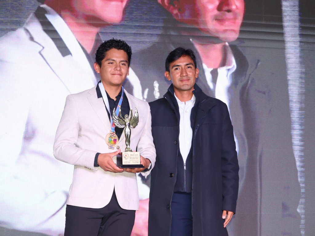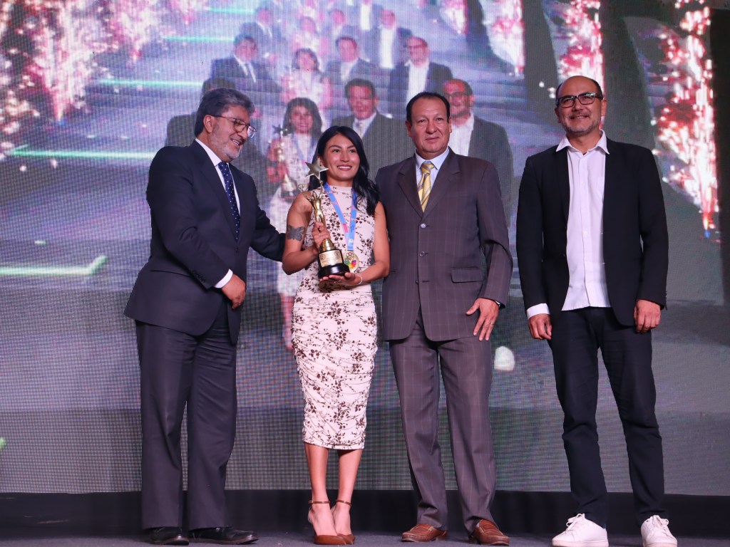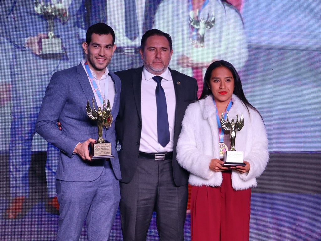 Paula Torres, Mejor Deportista del Azuay 2025, acompañada de Andrés Chocho y Manuel Bravo, Mejores: Entrenador y Dirigente